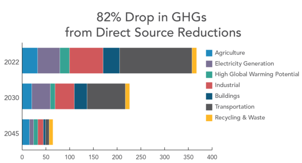 The major thrust of the plan is to nearly eliminate the use of fossil fuels anywhere in the state by 2045. This would assume a massive movement to electrify the transportation sector - cars, buses, trains, and trucks - which together are the largest single source of greenhouse gas (GHG) emissions in the state. It would also require the phasing out of how Californians heat their homes, elimination of certain chemicals and refrigerants, the expansion of power sources derived from wind, solar, hydrogen, and biomethane, and increased usage of Carbon Dioxide Capture and Sequestration (CCS).